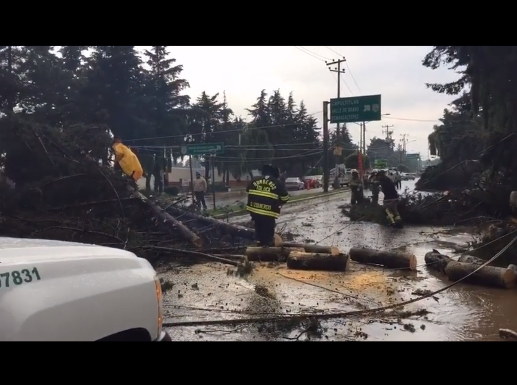 Árboles sobre Paseo Colón fueron derribados por ráfagas de viento y lluvia, al sur de Toluca; el tránsito vehicular esta restringido en los carriles de esta avenida debido a los trabajos para retirar las ramas y troncos que quedaron sobre la vía.