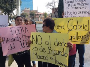 Con pancartas en las que se leían “Fuera Gabriel Gallegos de Tenancingo”, “No a la imposición”, “Fuera Ricardo Moreno del IEEM” y “Exigimos un proceso transparente”, integrantes de “Mujeres en Movimiento” acompañados de delegados y COPACIS se manifestaron frente al comité estatal de MORENA para expresar su descontento ante lo que consideran otra imposición de la corriente Grupo Acción Política (GAP), ahora con el nombramiento de Gerardo Gallegos como coordinador municipal sin dar oportunidad a militantes de base dentro del partido.