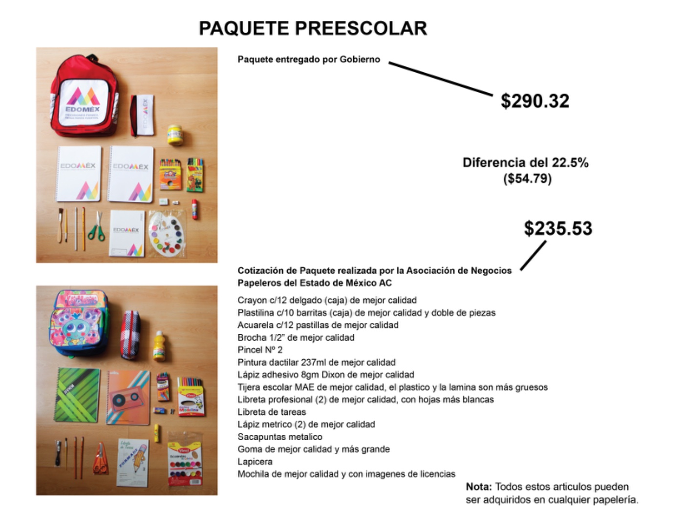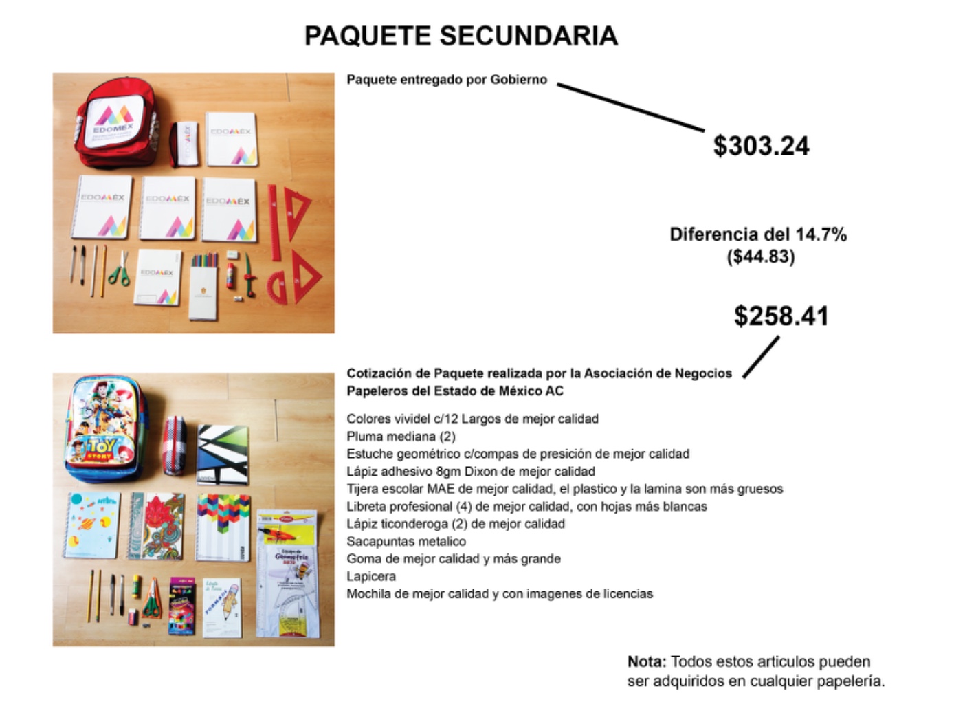 Detectaron una diferencia de 130 pesos por en la compra de materiales escolares por paquete cuyo costo asciende a 370 pesos y que, de acuerdo con los empresarios, se puede adquirir con sólo 240 pesos.