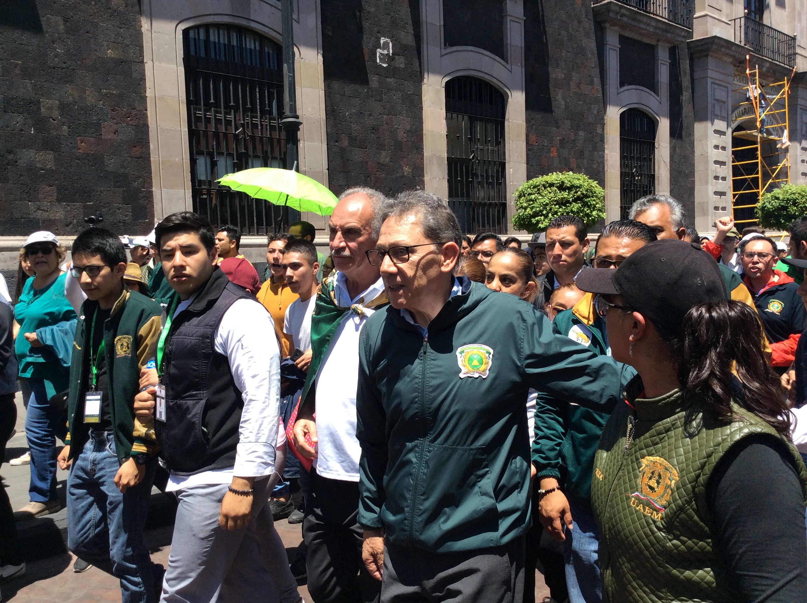 Como uno más, el rector de la Universidad Autónoma del Estado de México, Alfredo Barrera Baca, del brazo de varios universitarios encabezó la marcha por las calles de Toluca hasta la Cámara de Diputados, donde entregó en calidad de ciudadano la propuesta de reforma a la Legislación Universitaria.