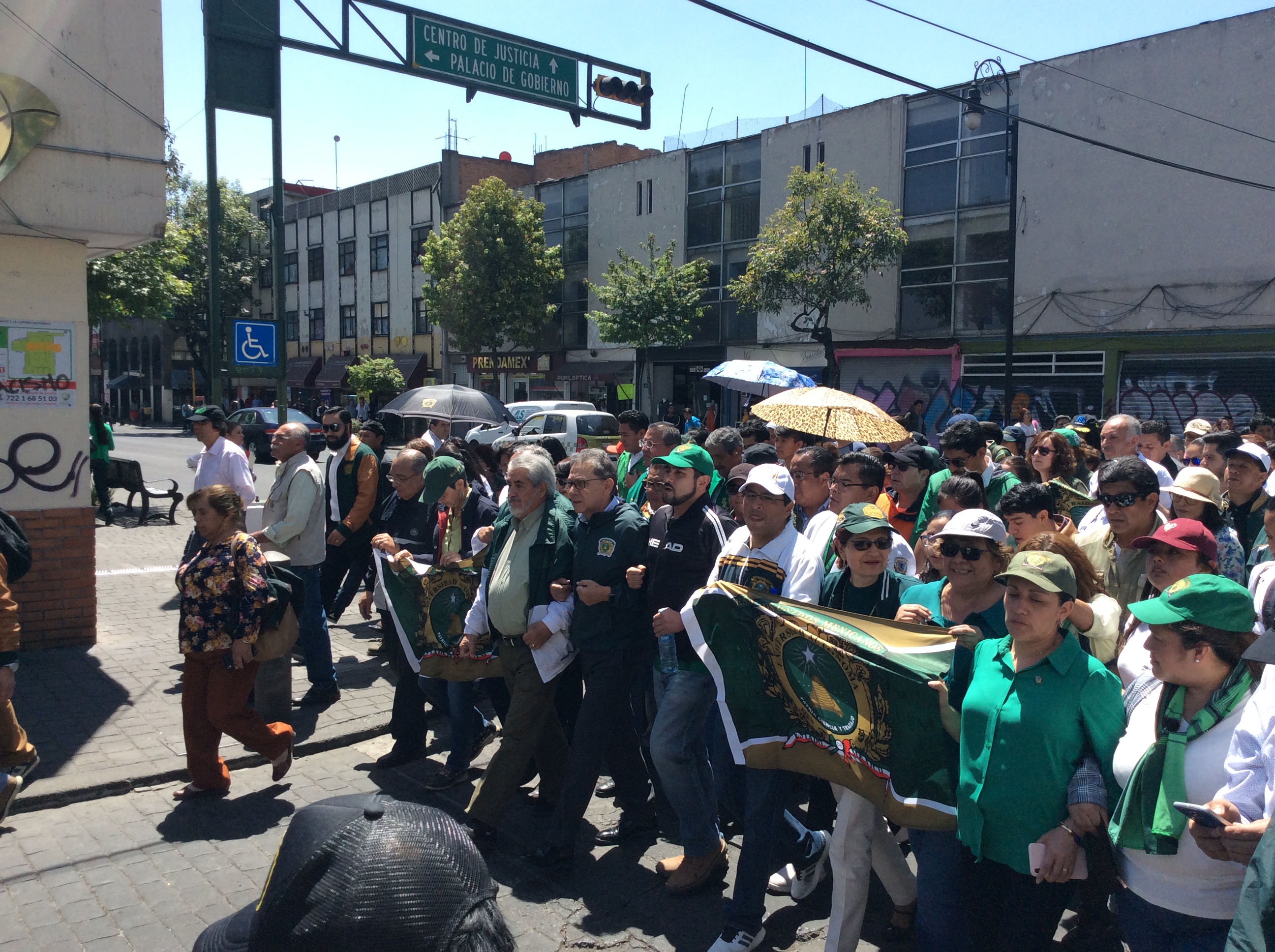 “U-A-E-M U-A-E-M, universidad… ¡autonomía!” se escuchó durante el recorrido en diferentes ocasiones, Alfredo Barrera Baca, gritaba la porra, con el puño levantado, segundos antes de ingresar a la Legislatura para entregar el documento que pretende sea analizado por los diputados mexiquenses -de mayoría morenistas- antes que la otra iniciativa.