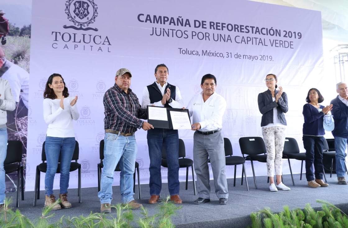 Durante el acto, Juan Rodolfo Sánchez Gómez y el suplente legal de la Gerencia Estatal de CONAFOR en el Estado de México, Felipe Morales Ramón, firmaron un convenio de donación de planta forestal a la capital y de 200 mil ejemplares para los Bienes Comunales de Santiago Tlacotepec.