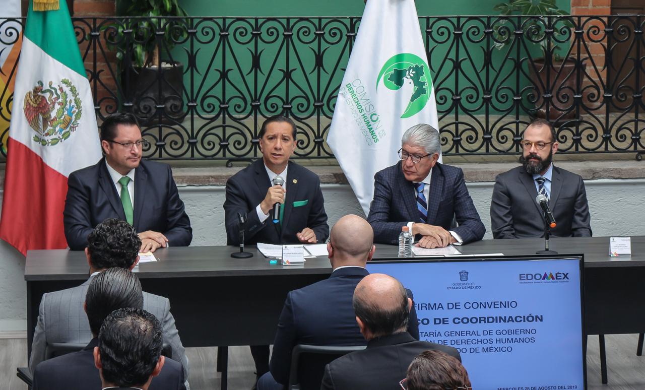 El presidente de la Comisión de Derechos Humanos del Estado de México Jorge Olvera García; el secretario general de Gobierno, Alejandro Ozuna Rivero, y el secretario de Justicia y Derechos Humanos del gobierno estatal, Rodrigo Espeleta Aladro, firmaron un Convenio Marco de Coordinación, a través del cual se intensificará la capacitación a las personas servidoras públicas en pos de una cultura de paz y derechos humanos.