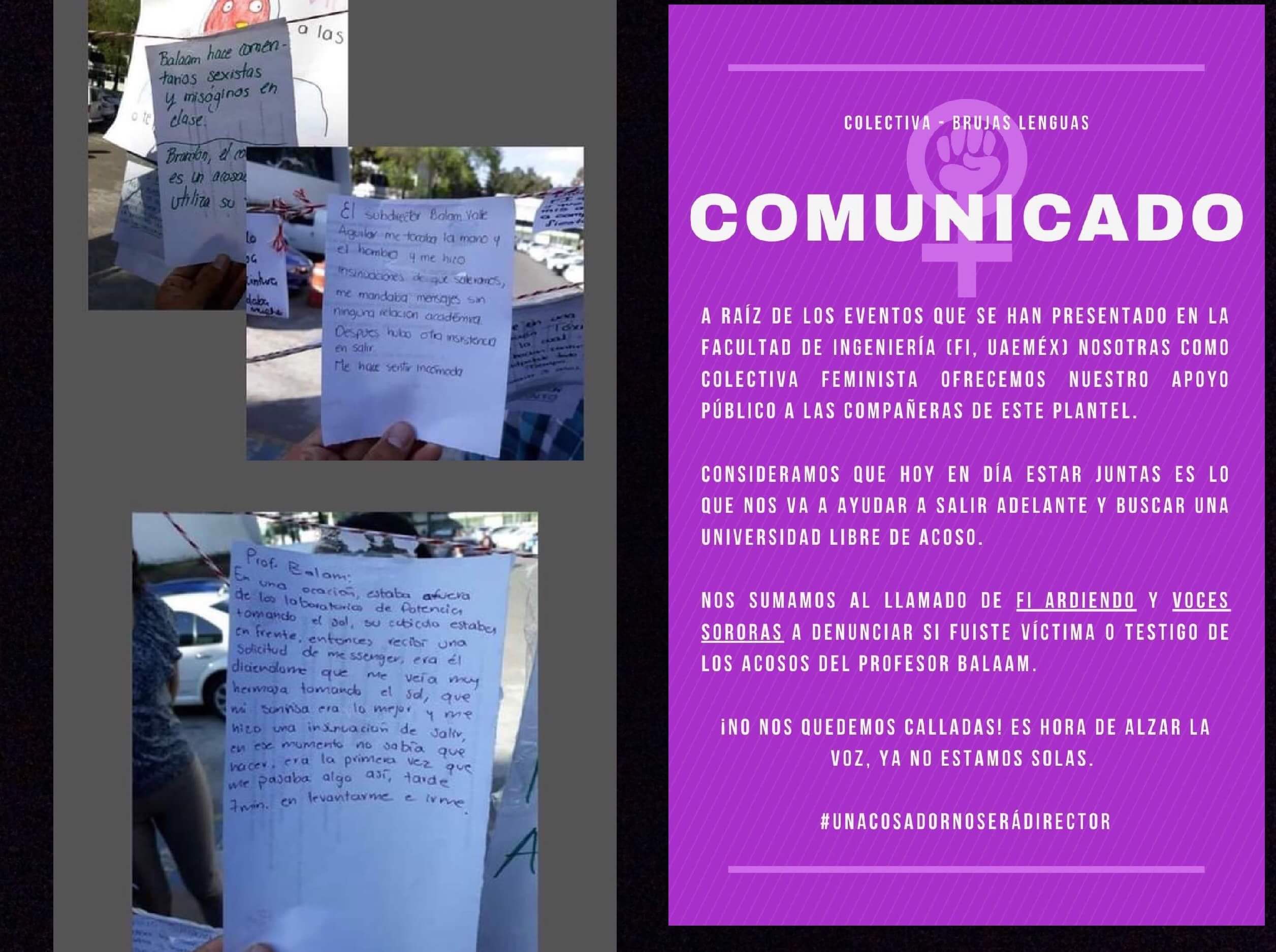 A través de la página Resistencia Violeta UAEMéx, FI ardiendo UAEMéx, Voces Sonoras y Brujas Lenguas se comenzó la campaña para impedir que el hoy subdirector académico busque dirigir la facultad.