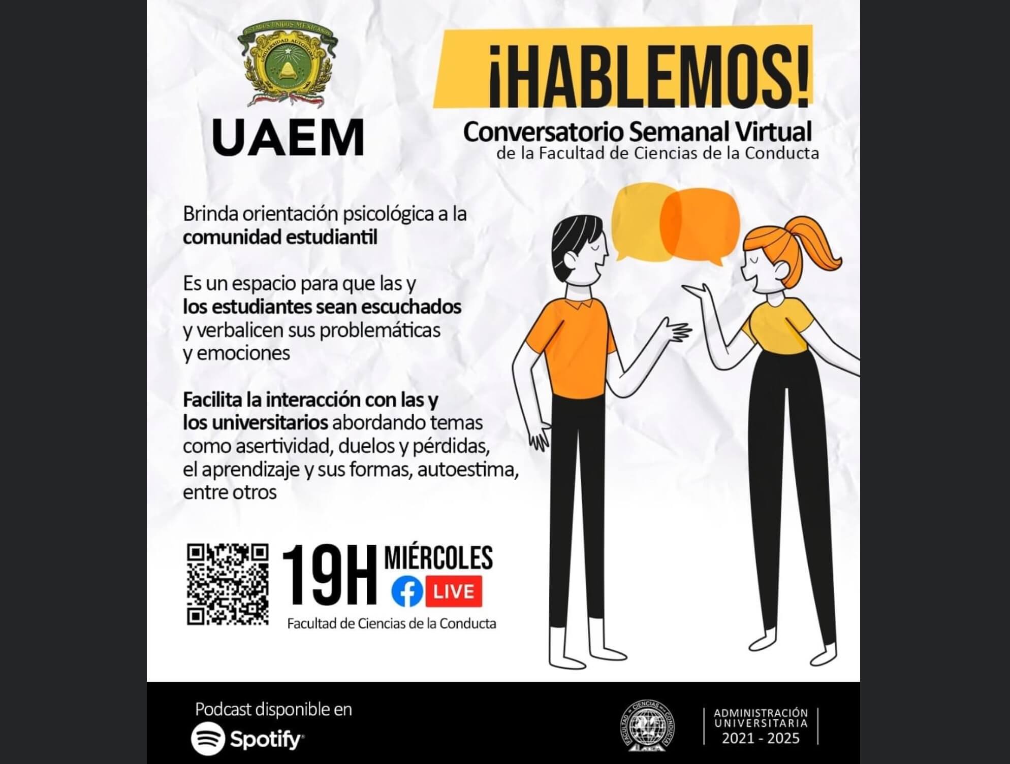 Ante la necesidad de canalizar adecuadamente las emociones y problemáticas por las que atraviesa la comunidad estudiantil a consecuencia del confinamiento sanitario por la COVID-19, la Facultad de Ciencias de la Conducta de la Universidad Autónoma del Estado de México (UAEM) impulsa el conversatorio “Hablemos”, que se transmite semanalmente a través de Facebook y en el cual se abordan diversos tópicos de interés para la comunidad estudiantil de la institución.