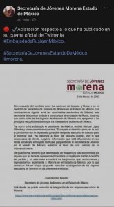 En sus redes sociales, José Benítez enfatizó que desde la Secretaría de Jóvenes coinciden con los principios de política exterior con que se ha manejado el presidente de México, Andrés Manuel López Obrador, por lo que desconoció el contenido de la información que dio a conocer mediante Twitter la embajada de Rusia.