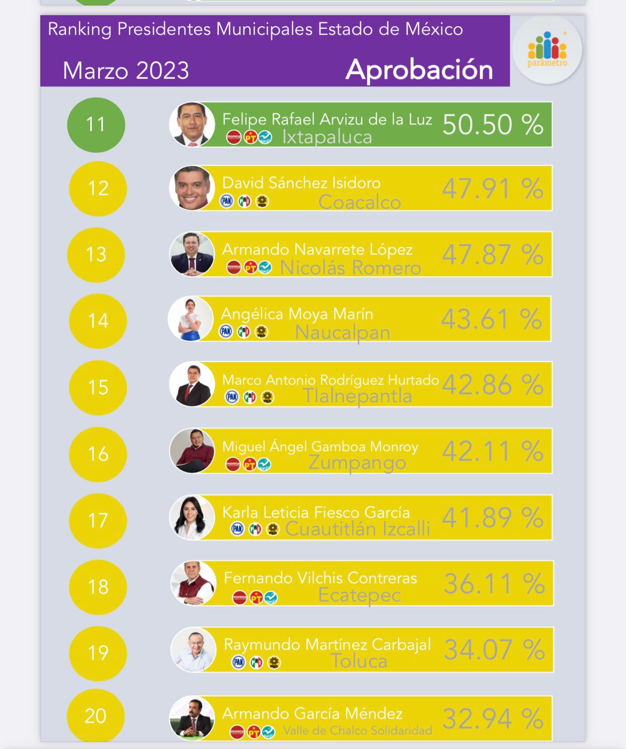 En el lugar 17 está la alcaldesa de Cuautitlán Izcalli, Karla Leticia Fiesco con un 41.89%; Marco Antonio Rodríguez Hurtado de Tlalnepantla 41.86% y Angélica Moya Marín de Naucalpan con el 43.61% en el lugar 14. En el lugar 12, David Sánchez Isidoro en Coacalco, 47.91% de calificación.