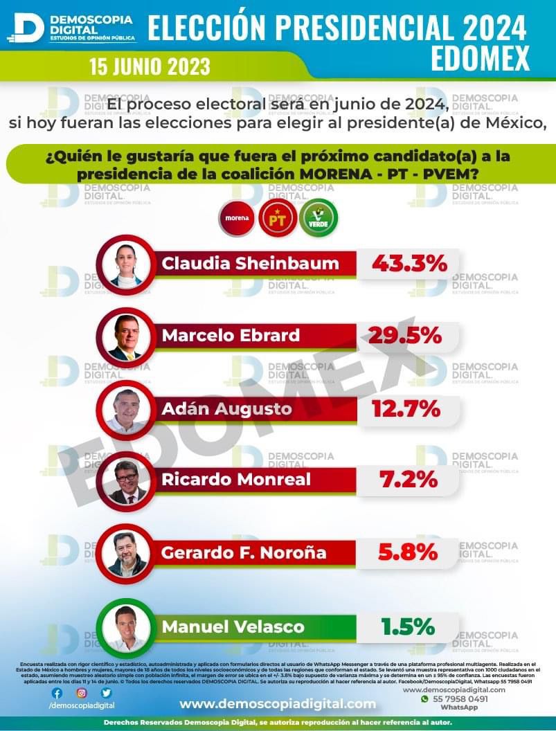 De acuerdo con la encuestadora Demoscopia Digital, rumbo al 2024 de los aspirantes a dirigir el país, por parte de Morena, Claudia Sheinbaum es la que lleva la delantera en las preferencias en el Estado de México.