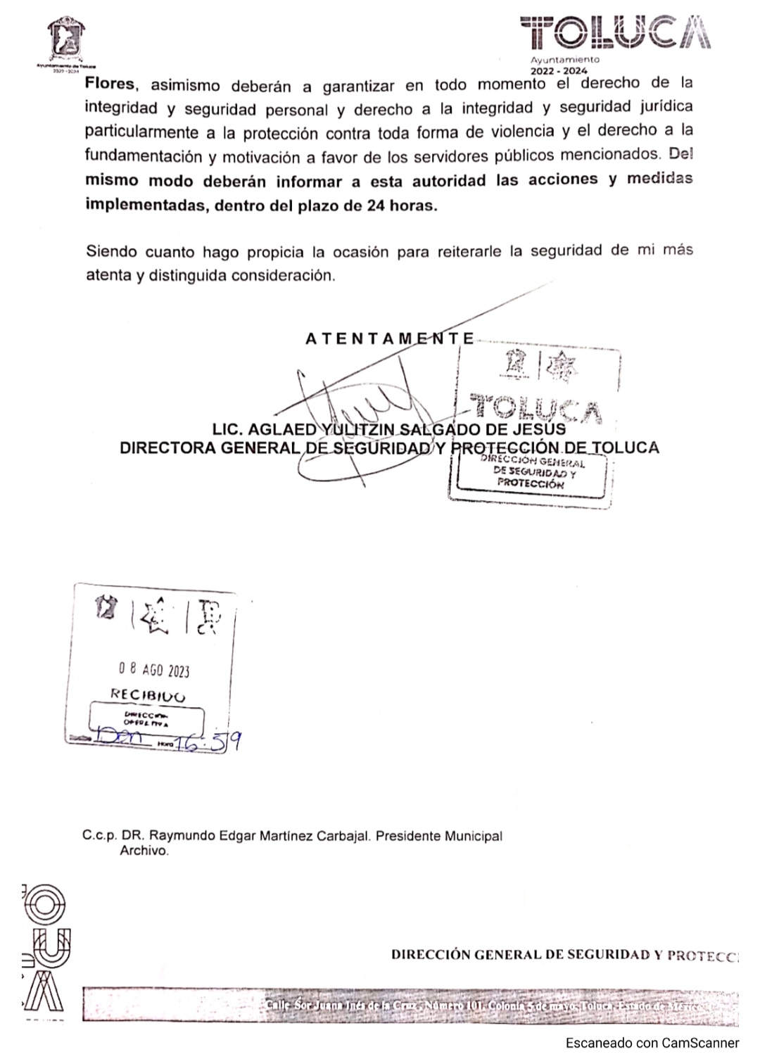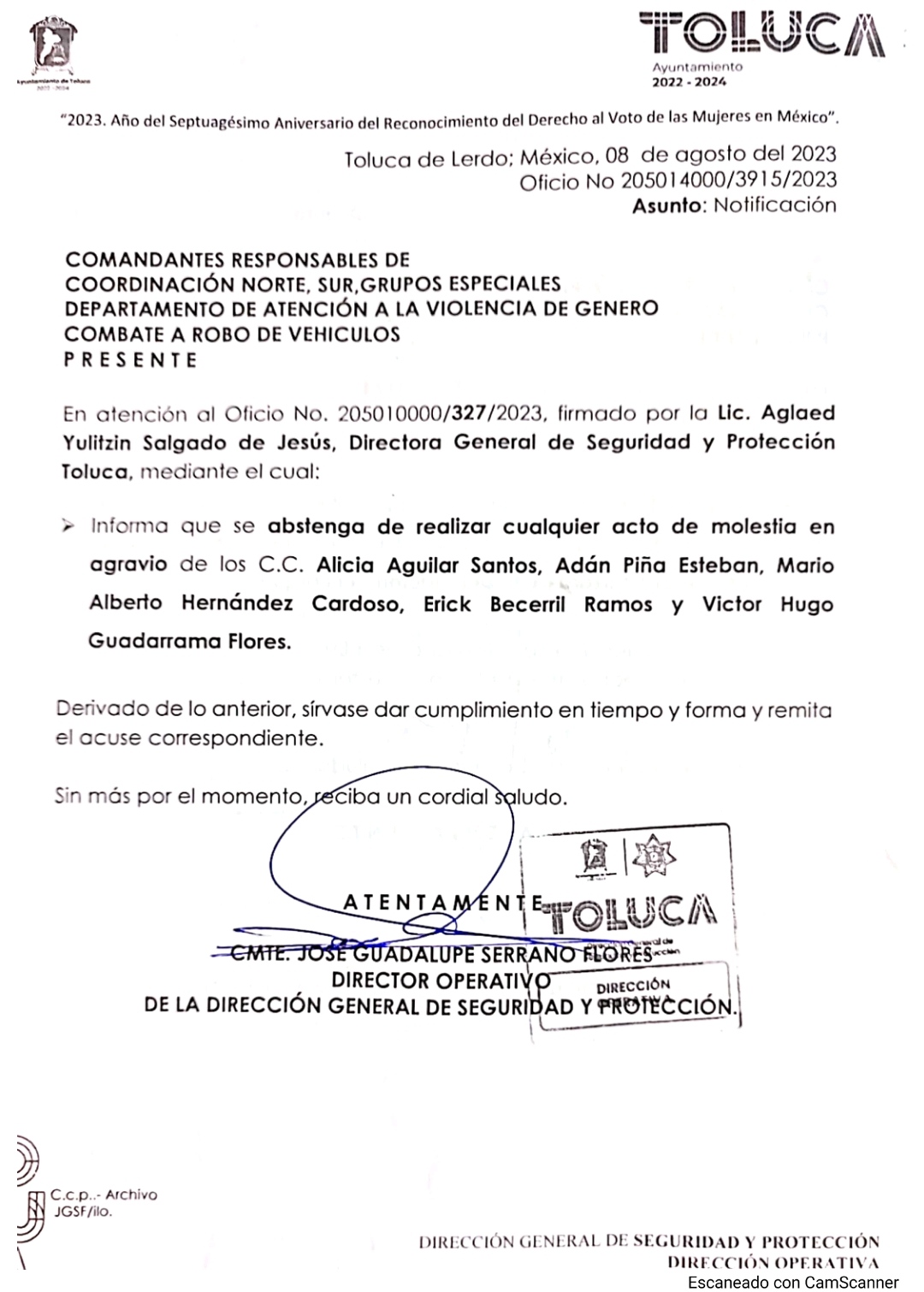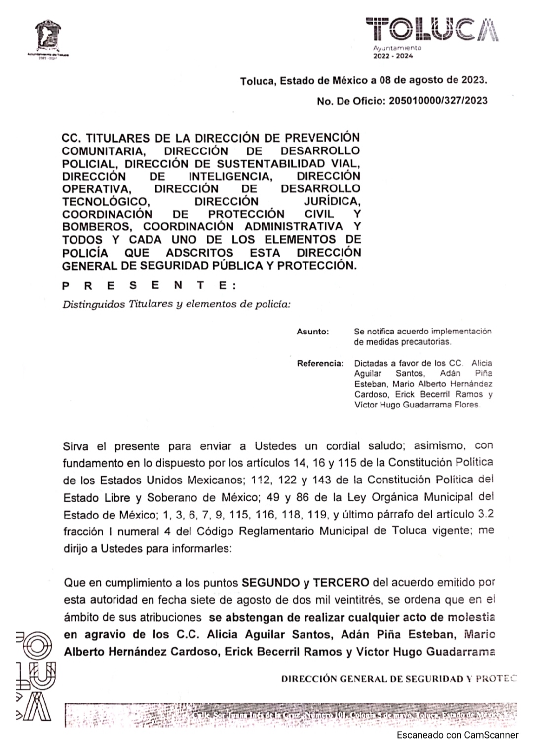 Sin embargo, comenzó a circular un oficioso donde se le solicita a los Comandantes de policía “Se abstenga de realizar cualquier acto de molestia en agravio de los C.C. Alicia Aguilar Santos, Adán Piña Esteban, Mario Alberto Hernández Cardoso, Erick Becerril Ramos y Victor Hugo Guadarrama Flores”.