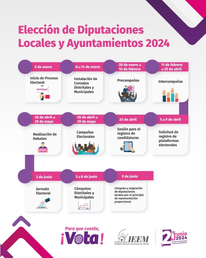 El 25 de abril se realizará el registro de candidatos ante el IEEM. Del 26 de abril al 29 de Mayo se realizará la campaña y debates.
