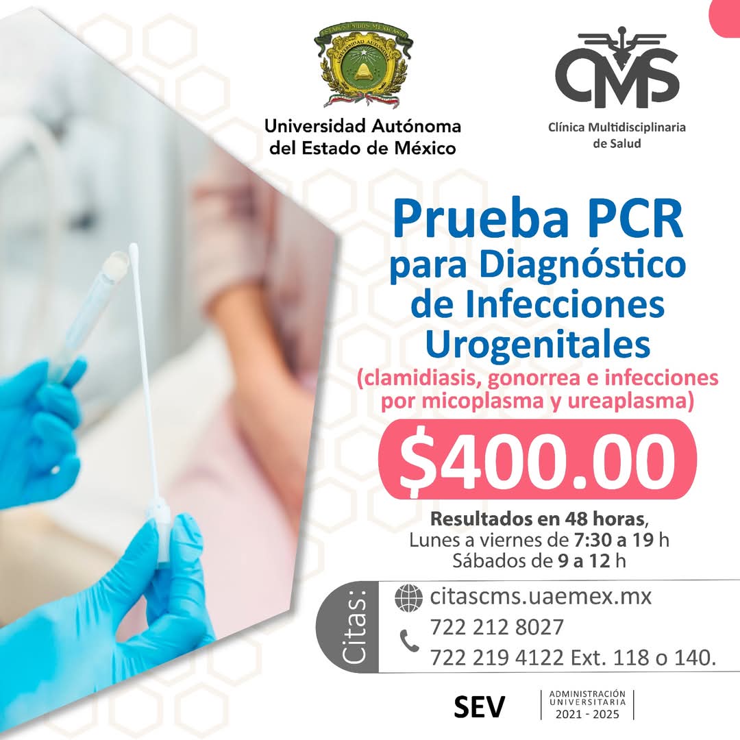 La Clínica Multidisciplinaria de Salud (CMS) de la Universidad Autónoma del Estado de México (UAEMéx) ofrece la Prueba PCR para Diagnóstico de Infecciones Urogenitales para la detección de Enfermedades de Transmisión Sexual (ETS), de diagnóstico temprano y preciso .