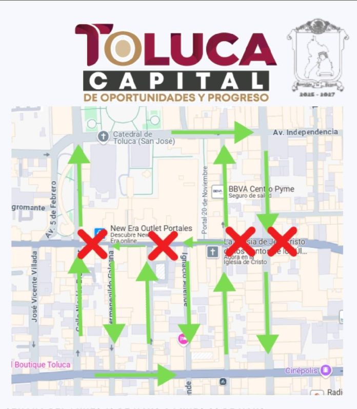 Los cierres afectarán los siguientes cruces: Avenida Hidalgo con Juárez (cerrado desde Ignacio López Rayón); con Aldama (cerrado desde Benito Juárez); con Matamoros (cerrado desde Ignacio Allende) y Nicolás con Bravo (cerrado desde Hermenegildo Galeana).