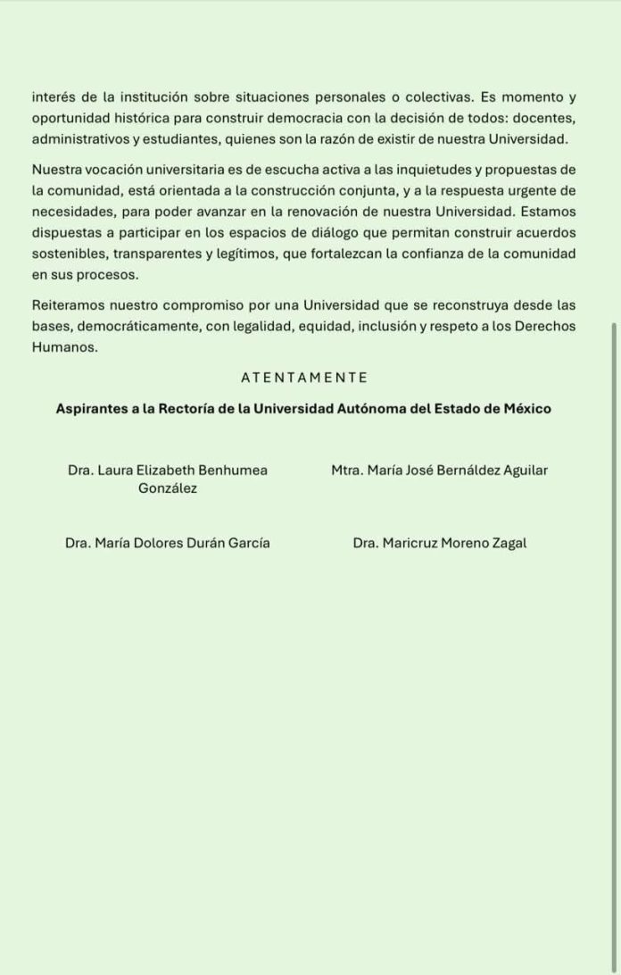 Aspirantes a la Rectoría de la Universidad Autónoma del Estado de México (UAEMéx) lanzan comunicado de prensa, donde piden concluir el proceso de sucesión, sin la firma de Patricia Zarza.