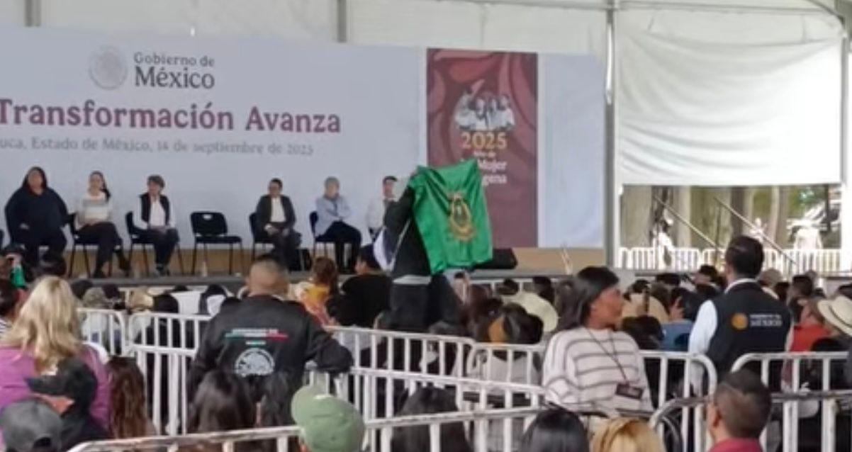 En un primer momento un parista se acercó al podium, donde estaban varios secretarios de estado y la Gobernadora, Delfina Gómez Álvarez, sacó el escudo de la Universidad, acto que la Presidenta del país permitió.