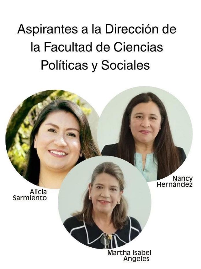 Se registran tres aspirantes para contender por la Dirección de la facultad de Ciencias Políticas y Sociales de la Universidad Autónoma del Estado de México (UAEMéx): Alicia Sarmiento Velásquez, Nancy Hernandez Pichardo y Martha Isabel Ángeles Constantino.